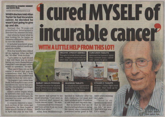 Tras la tajante condena (diagnóstico) de los médicos, Allan Taylor podría haber sucumbido cuando le dijeron que no podían hacer nada para tratar su condición. Sin embargo, el abuelo de 78-años de edad que no tenía nada que perder, excepto su dignidad, no se rindió, y buscó en el Internet algún método alternativo para combatir el cáncer.
